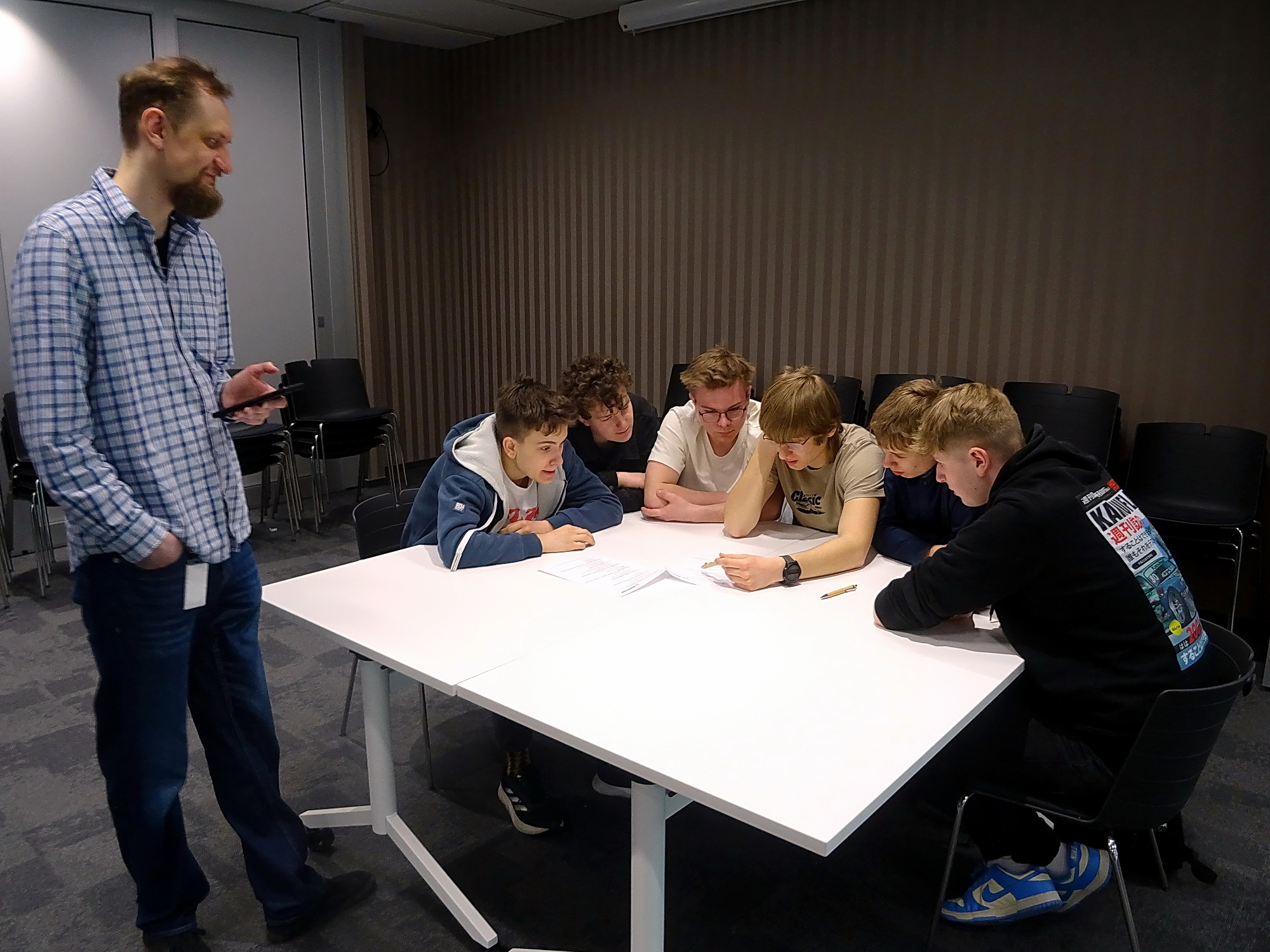 Na zdjęciu: jeden z jurorów – Łukasz Szubart, obserwujący pracę naszych uczniów: Karola Tyrańskiego i Michała Czarneckego z kl. 3cT, Szymona Jagiełłę i Kamila Lauzera z kl. 3bT oraz Pawła Golenia (2cT) i Bartosza Stanica (3cT).